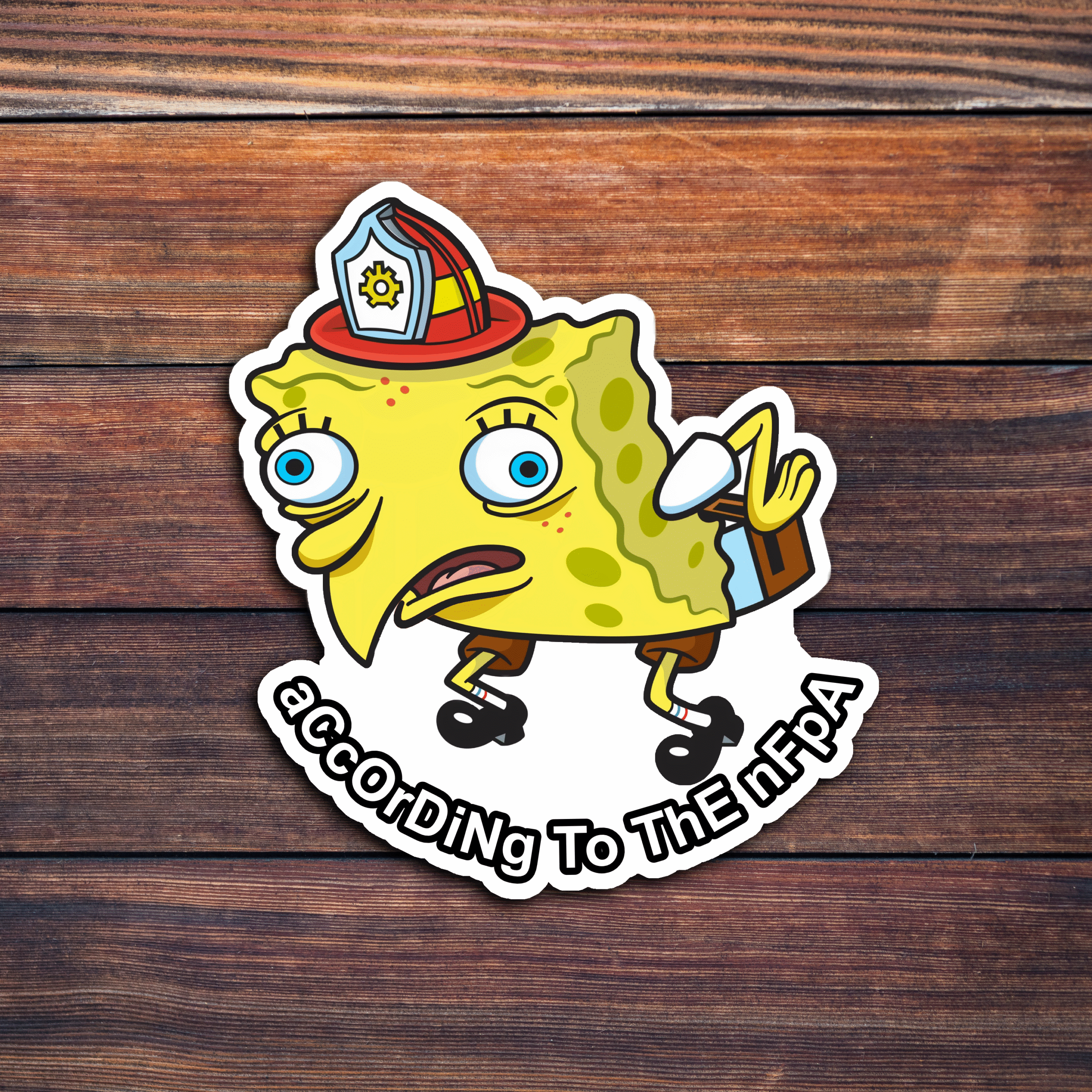 Our distorted SpongeBob (now a bonafide safety compliance officer) comes complete with a fire helmet, dead eyes, and that signature mocking tone we all know and hate. The caption? A passive-aggressive masterpiece: “aCcOrDiNg To ThE nFpA”—you know, the sacred words uttered before someone tries to cancel actual problem-solving with a binder of rules.